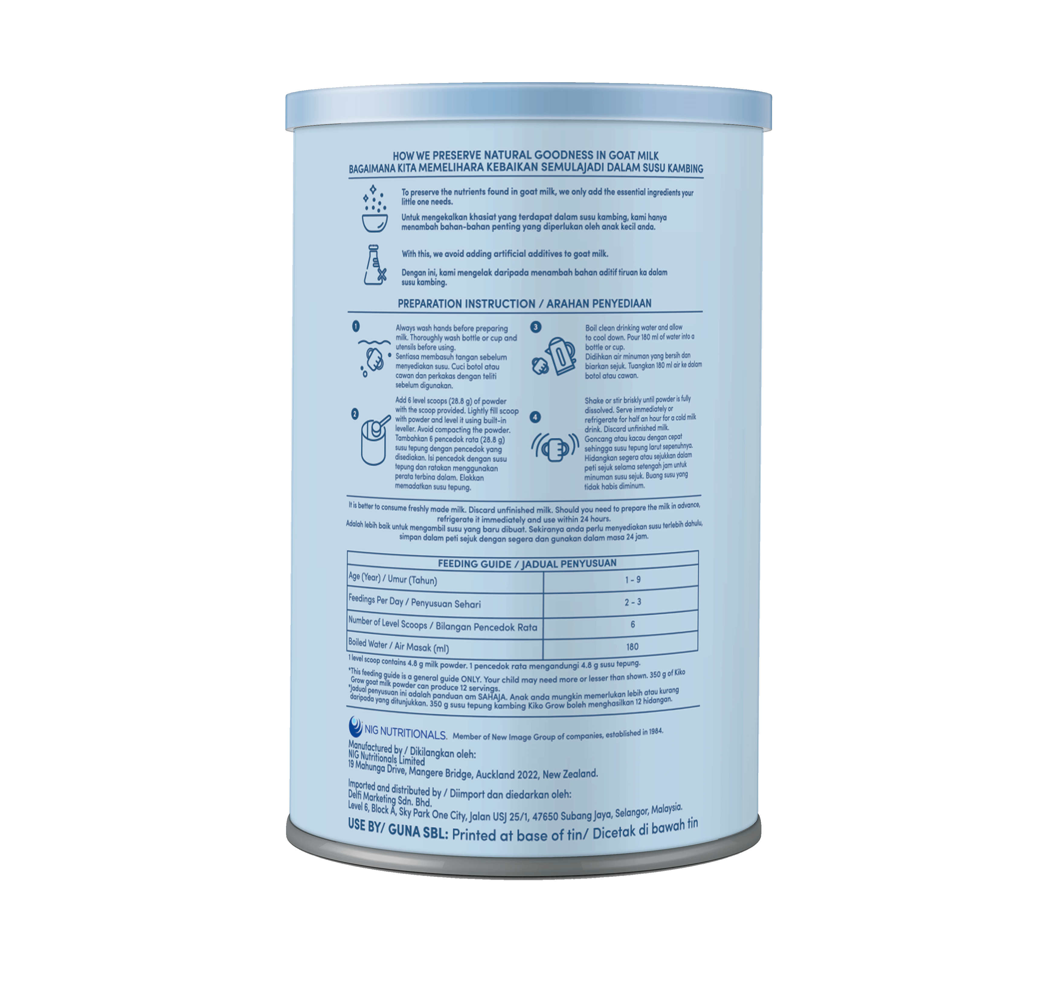 Minuman Susu Kambing Kiko Grow untuk kanak-kanak berumur 1–9 tahun dihasilkan di New Zealand menggunakan 100% susu kambing penuh.